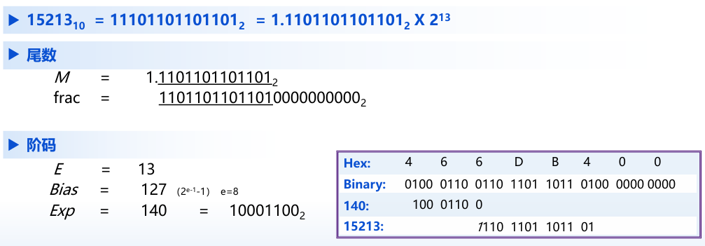 浮点数表示范围广但精度有限,其数值:$V = (-1)^s \cdot M \cdot 2^E$