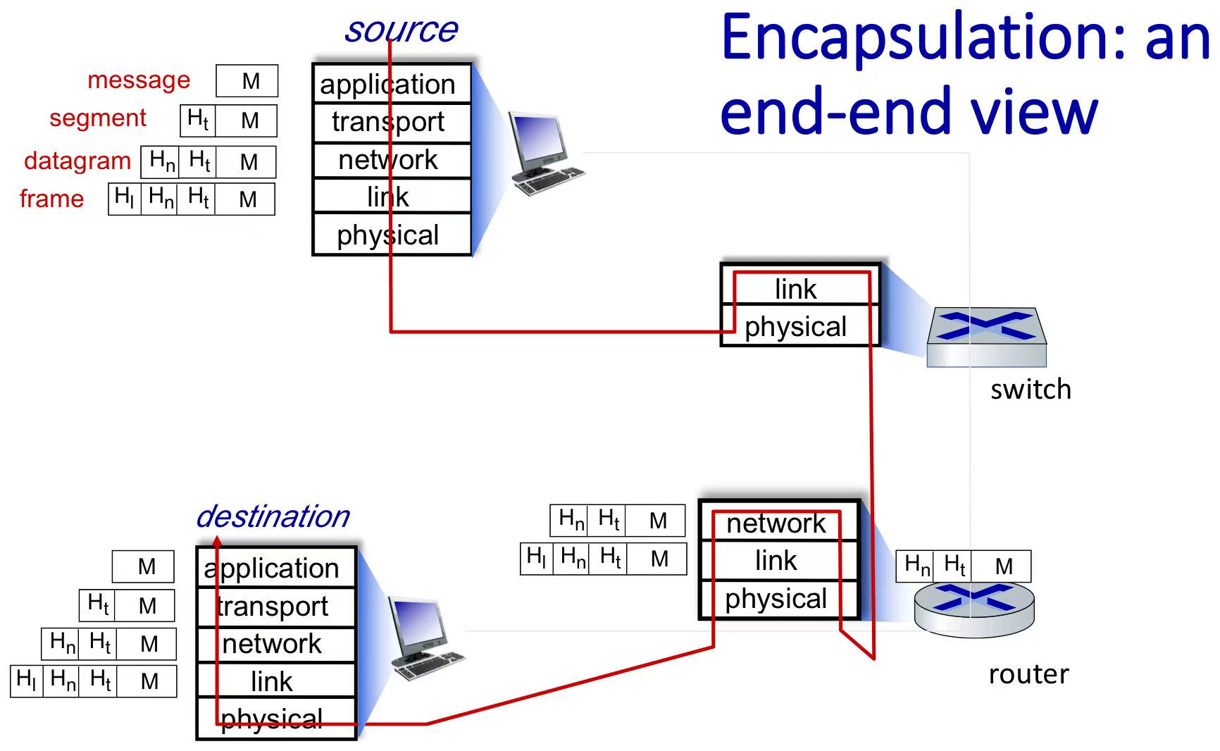 Encapsulation: Data is encapsulated as it moves down the protocol stack. Each layer adds its header information to the data received from the layer above, creating a packet with header fields and a payload field.